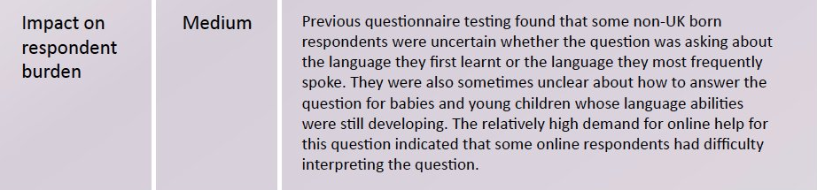 We are aware that the ONS trialled a number of alternative questions before deciding on the ‘main language’ question (for England and Wales) and could not find a satisfactory question that allowed multiple languages in the response. Nevertheless we think that relatively small changes to the question, allowing for more than one language to be reported, would greatly improve the quality of the data and its usefulness. We believe that what is desirable is a question which would not force the respondents to choose between English and another language (e.g. their heritage or community language) and would allow them to name more than one language apart from English. We know of a number of countries that have successfully implemented such questions in their national censuses, in a variety of ways.