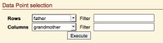 The interface provides Data Point selection tools. These will list all the labels that have been defined. One Data Point selection tool is labelled 'Rows', all the values for the Data Point selected here will form the row columns in the output table. One Data Point selection tool is labelled 'Columns', all values for the Data Point selected here will be used as the column headings in the output table.